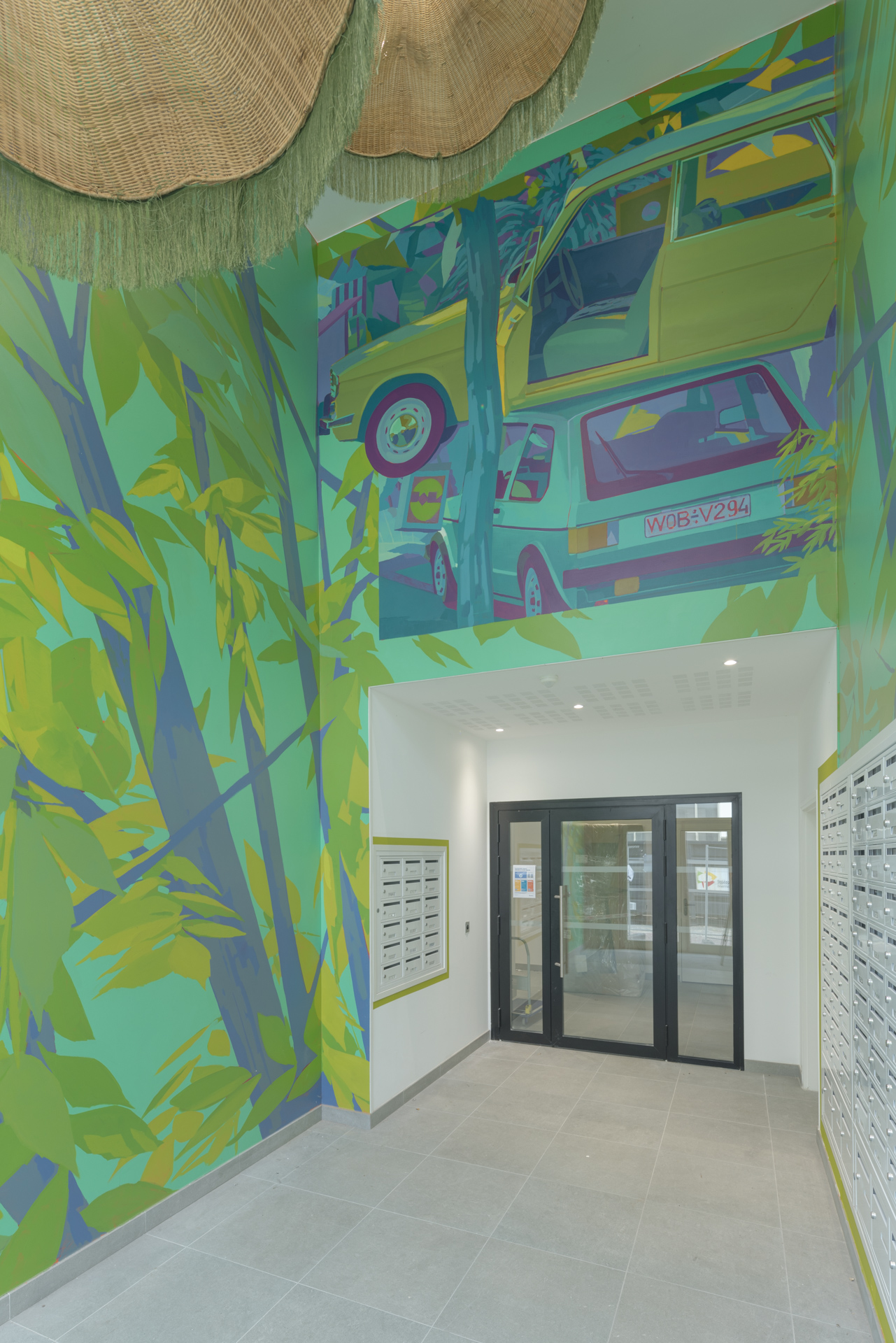 Les halls des jardins et des patios de Gaïa prennent vie sous les couleurs de Fred Battle ! Ses œuvres murales plongent les résidents dans un univers artistique immersif, habillant chaque mur d’une touche vibrante et unique.